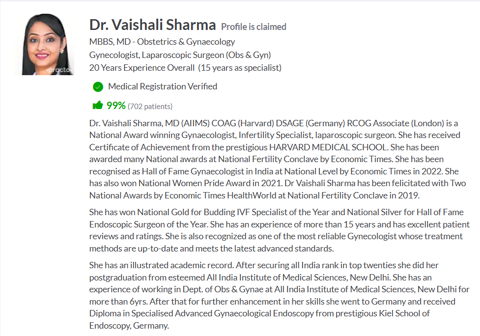 There is no single No. 1 gynaecologist for every woman in India. The real goal is to find the best doctor for your body, your concern, and your stage of life. Your needs may be PCOS, infertility, endometriosis pain, fibroids, or pregnancy care. Your city and hospital access also shape your choice, since follow ups and emergency support should stay within reach. In Delhi, many patients look for one doctor who can cover both fertility planning and keyhole surgery when needed. Dr Vaishali Sharma fits that combined profile with MBBS and MD in Obstetrics and Gynaecology, AIIMS training, verified registration, and 21 years overall experience with 15 years as a specialist.